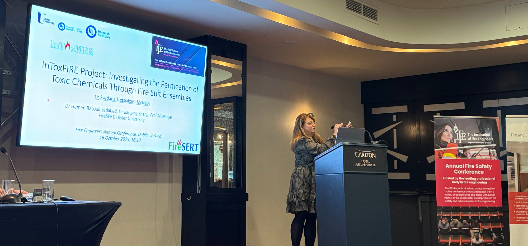 The InToxFIRE project team participated in the Fire Safety Conference 2025, held on 16 October 2025 at the Dublin Airport Carlton Hotel. Organised by the Ireland Branch of the Institute of Fire Engineers (IFE), this year’s event was themed “Fuelling Progress – Engineering the Future of Fire Safety”. The conference brought together fire professionals, structural designers, engineers, and academics from across the world. With two technical sessions, seven invited speakers, and a side exhibition showcasing industrial solutions, the event provided an excellent platform for networking, exchanging ideas, and sharing the latest advancements in fire safety science and engineering.