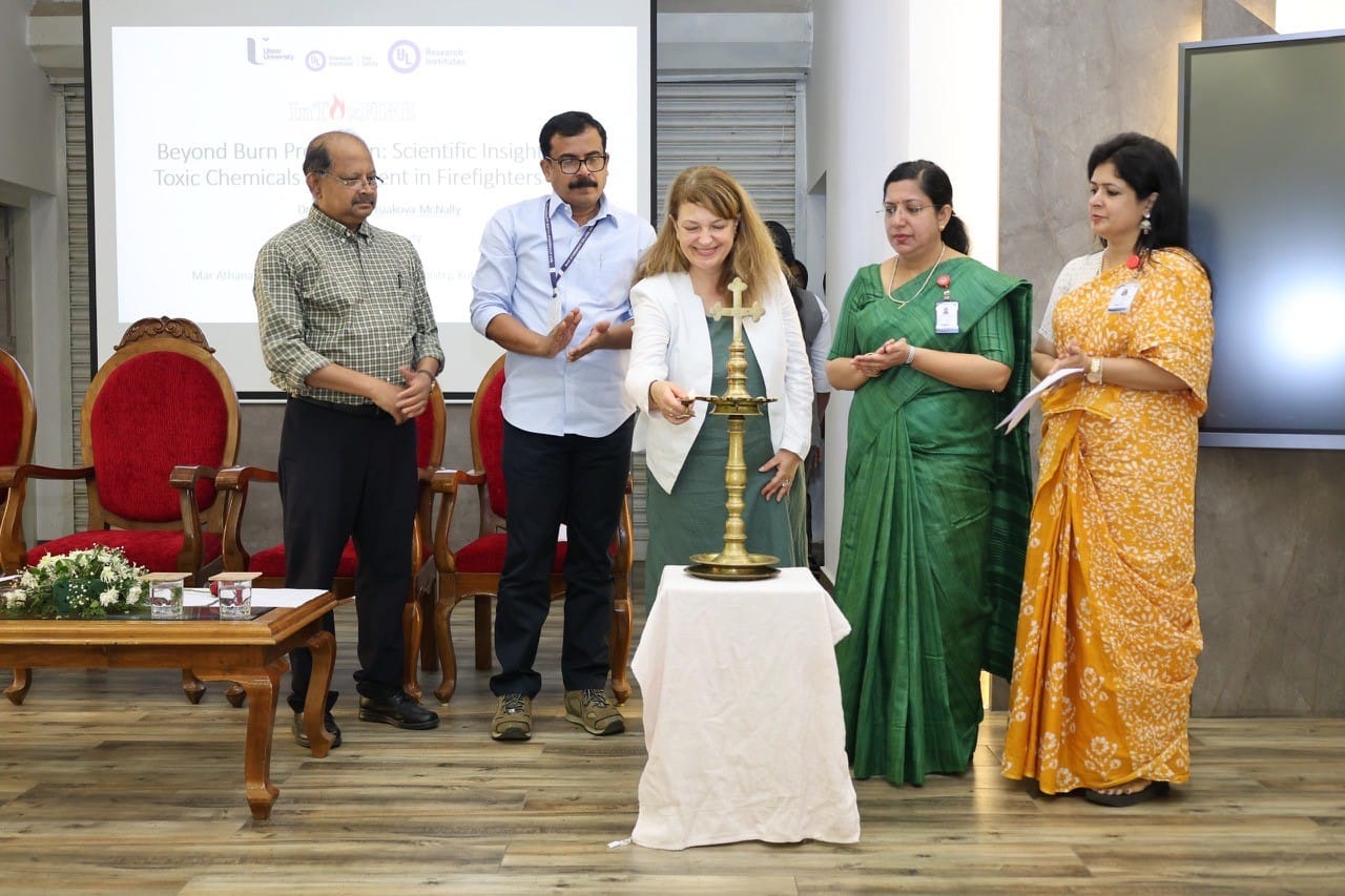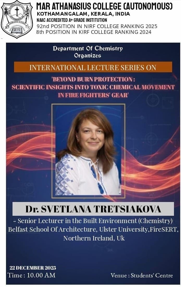 On Monday, 22nd December 2025, Dr. Svetlana Tretsiakova-McNally delivered an insightful keynote speech titled “Beyond Burn Protection: Scientific Insights into Toxic Chemicals Movement in Firefighters Gear” at Mar Athanasius College (MAC), Kothamangalam (Kerala, India). The event was hosted in student centre and attracted a diverse audience of the staff and students at the Department of Chemistry, MAC and Mar Athanasius International School (MIAS).
